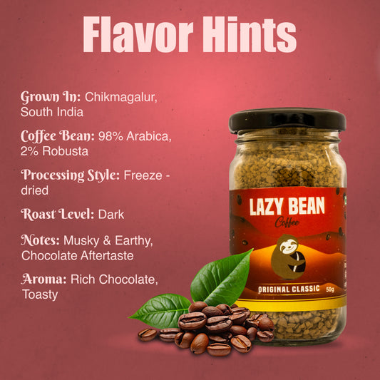 Simply mix 1–2 teaspoons of Lazy Bean Coffee with hot water or milk, Add Sugar to sweeten it and stir, and enjoy. Adjust quantity based on your strength preference.